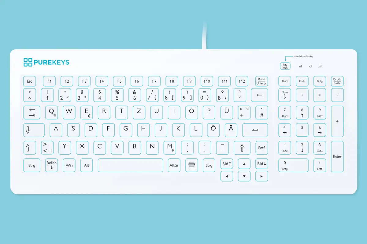 Mit Purekeys erwerben Sie die wichtigsten Funktionen die eine Hygienetastatur haben sollte: eine schnelle und vor allem gründliche Reinigung sowie ein sehr gutes Schreibgefühl.
