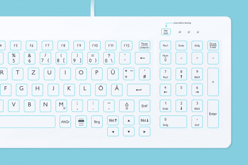 Medizinische Computertastatur mit USB-Kabel, desinfizierbar mit allen üblichen Reinigungsmitteln.
